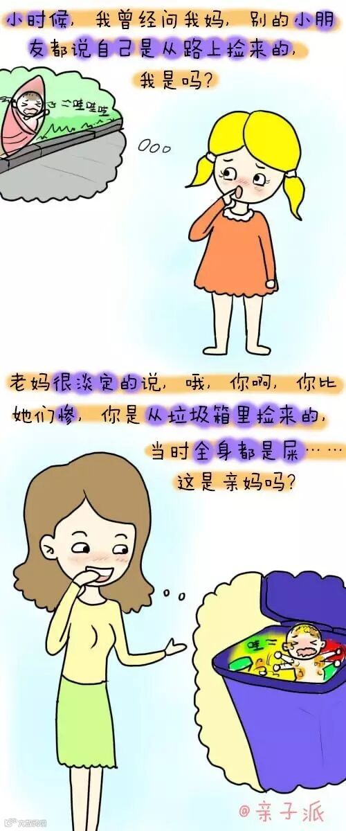 开始我还很忧伤,是不是我真的不是亲生的啊,我是从垃圾桶里捡来的,可后来大家都说自己是捡来的,我也就淡定了,如今我有了娃,孩子再问我是从哪里来的,我回答的比我爸妈好多了呢,我告诉我娃:恩,你是从妈妈肚脐眼里出来的……