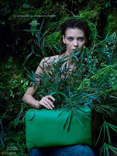 爱马仕(Hermès)2014春夏广告大片中,深色头发的模特仿佛化身为丛林精灵,在浓郁的热带雨林绿色中,展示了这款爱马仕2014春夏手袋。