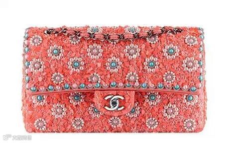 香奈儿(Chanel)2014春夏系列,将其口盖包重新演绎,经典的口盖包采用斜纹软呢布料,绣以大片的珍珠和亮片,加上白色的蕾丝,仿佛绽放着的娇艳花朵,充满了浪漫的春日气息。