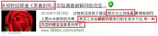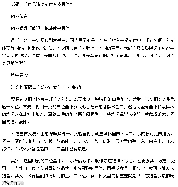 央视二套财经频道有一个节目叫做“是真的吗”,曾经报道过“手能迅速把液体变固体”,说的其实就是三水醋酸钠的饱和结晶功能,这个大家可以搜一下顺便做下实验,还是挺好玩儿的。(动图太大,自己搜)