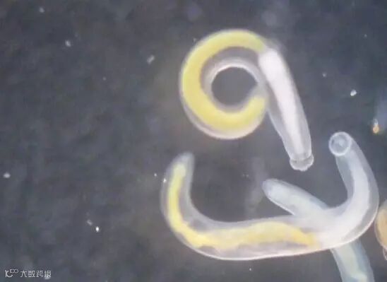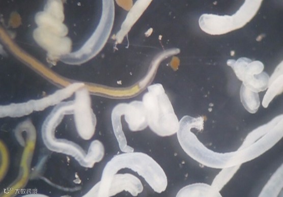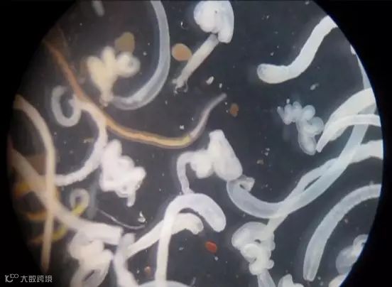 实验君把它放在解剖镜下观察。我勒个苍天!一大片蠕动的虫子!透明的表皮,黄色和白色的身体,有的展开身子像蚯蚓一样游动,有的盘起来像螺蛳一样!可以想象这些家伙在我们的胃里会是什么样!