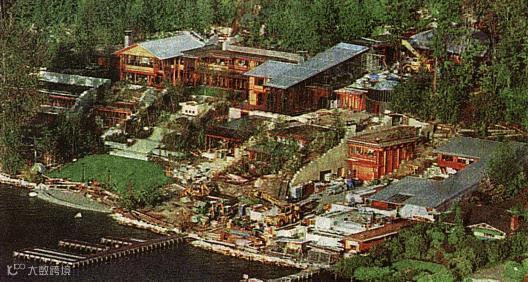 这幢豪宅前方俯瞰华盛顿湖,背后深入湖畔东岸的一座山丘,属于“掩土建筑”,犹如一座堡垒要塞。豪宅与西雅图市遥遥相对,邻近雷蒙市的微软公司总部。建筑物地上四层,地下深不可测,外观呈现“西北太平洋岸别墅”风格,看似一座十八、十九世纪的庄园。