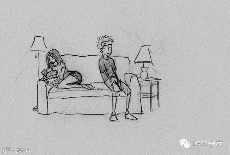 7/9/12. “今晚我们本来都要很多工作的事要完成,但还是窝在沙发上,她读书给我听,我偶尔弹一点吉他,然后画一幅画。事实上在完成《365天绘画日记》后有一阵子没有为她画画了。这些事都比工作要美妙许多。躺在沙发上的时候,我喜欢让双腿在空气中漂浮,有时候是双臂,不知道为什么。”
