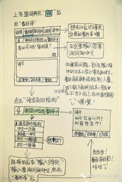 90后青岛姑娘王婧的父母即将去韩国旅游,为了帮老两口在语言不通的韩国解决购物、吃饭、打电话等问题,她就画了绘本教父母用智能手机App,教他们用翻译软件和当地人交流,还教他们用社交软件随时与自己通话。姑娘如此有爱,网友们感动一片。