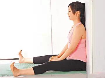 1.背靠墙坐瑜伽垫上,双脚张开与肩宽,瑜伽球置两腿间以手掌轻扶。