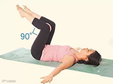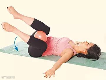 1.平躺瑜伽垫上,双脚屈膝约90度,两膝夹瑜伽球,双手外伸贴地。