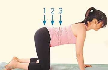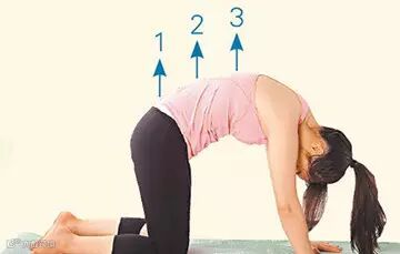 2.从尾椎、腰、背开始慢慢向上拱起背部,头颈自然朝下,停留数秒回正。