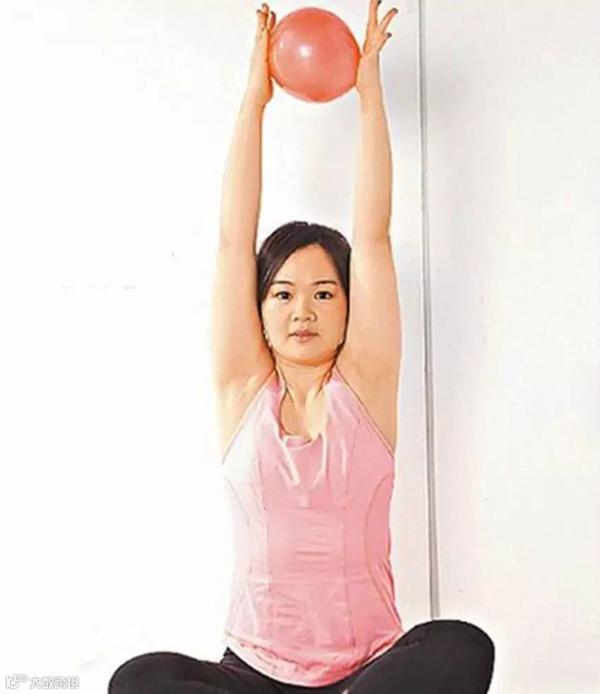 1.背贴墙坐瑜伽垫上,双手持瑜伽球将手臂向上举。