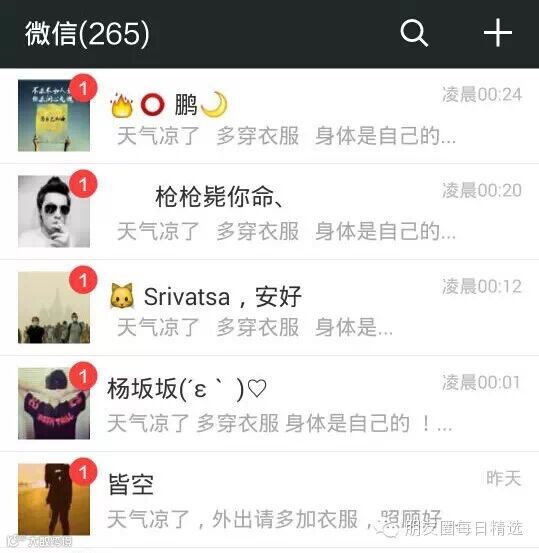 一天收到至少十条这样的微信:天气凉了,注意穿衣服,健康最重要……本条信息群发,打开微信,设置,通用,群发助手,全选,看有多少朋友把你删了,你顺便也把他删了。