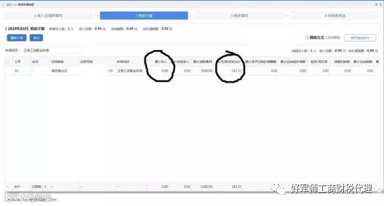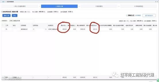 因此,企业在为该员工进行工资薪金所得个人所得税扣缴申报时,其“累计收入”为企业“上月为其申报的收入数+361.53元”;如果员工是第一个月入职,则其”累计收入“为361.53元。