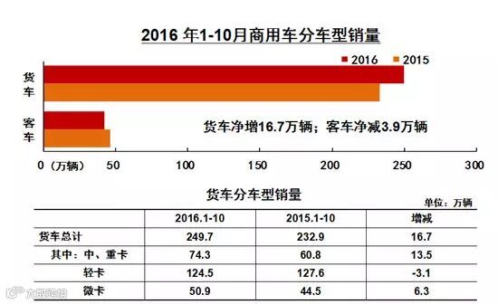 货车产销248.03万辆和249.66万辆,同比增长7.32%和7.18%。其中:重型货车产销55.42万辆和56.58万辆,同比增长24.16%和24.62%;中型货车产销17.13万辆和17.71万辆,同比增长10.81%和15.19%;轻型货车产销123.75万辆和124.50万辆,同比下降2.86%和2.45%;微型货车产销51.73万辆和50.87万辆,同比增长18.60%和14.23%。