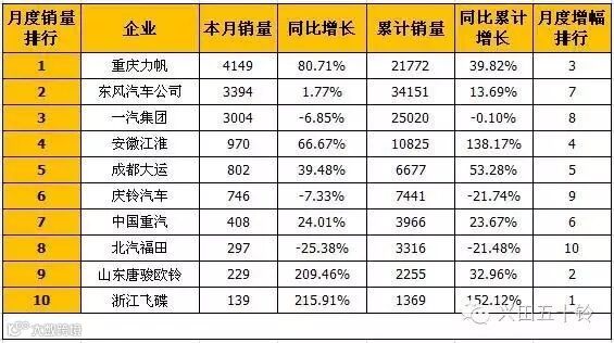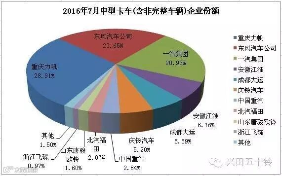 2016年7月份,国内中型卡车(含非完整车辆)销售14353辆,销量排名前十的企业共计销售14138辆,占据整个中型卡车(含非完整车辆)市场总销量98.50%的份额。具体排名如下: