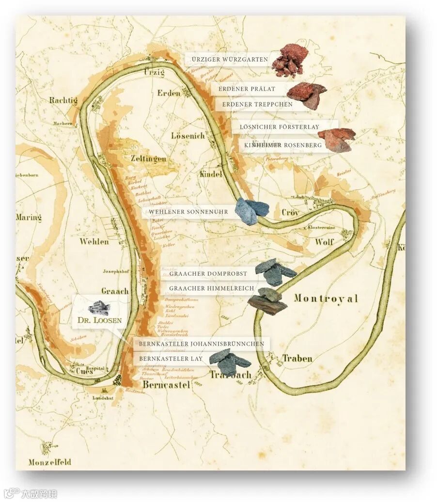 由于德国地处欧洲能够成熟葡萄的最北界限,温度至关重要,而河水可以反光吸热,朝南方向的日照最为强烈,越是陡峭的山坡,葡萄园越是温暖。故而,在旧时的德国地图上,最靠近河岸的朝南(或西南)的葡萄园通常被划分为特级园,同理,一级园要比二级园更靠近河岸,村级园位于山坡最上方。这跟勃艮第最好的葡萄园位于山坡中间一说迥异不同。