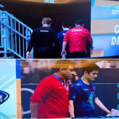 第三场开始前,王皓带着全身湿透的樊振东出去换球衣,进行了一场来自中国乒乓球队的神秘力量——心灵按摩。
