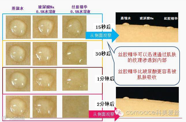 众所周知,玻尿酸作为保湿利器一直广受迷妹们的追捧,下图可以看出2分钟后丝胶精华比玻尿酸渗透更快更迅速,丝胶的保湿效果更胜一筹哦~