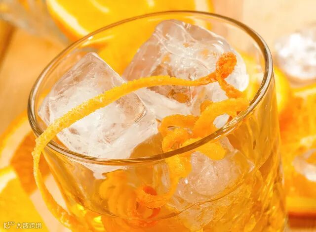 材料:苏玳一级庄老佛爷贵腐酒、 冰块、 2薄片橙皮