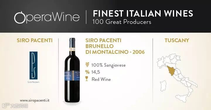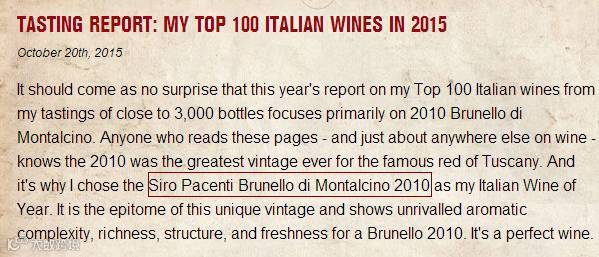 近日,这位全世界最重要的酒评人,杰姆斯·萨克林在品尝了近3000款意大利的葡萄酒后,在万众瞩目中发布了他的意大利“百大”葡萄酒榜单。其中,希罗•帕森第酒庄蒙塔奇诺布鲁诺干红葡萄酒(Brunello di Montalcino, Siro Pacenti)荣登榜首,并且被杰姆斯·萨克林评选为他心目中的年度最佳!