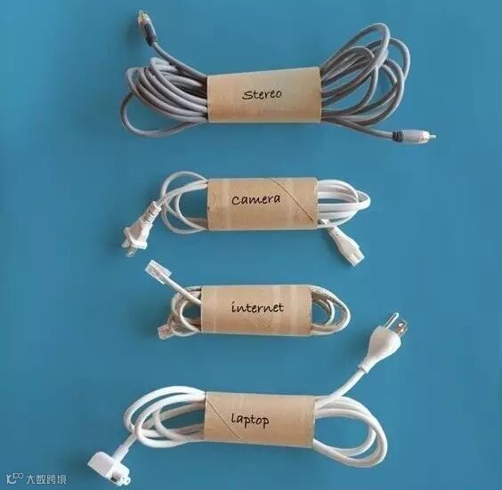 家里电线、数据线一大堆,随便扔哪都找不到。把电线卷起来放在纸筒里,写上名称,一目了然。