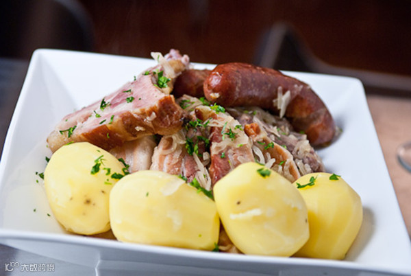 这道菜是阿尔萨斯地区的传统菜肴,从地理位置上来看阿尔萨斯非常靠近德国,这道菜也更像是大分量的德国菜,香肠、猪肋骨肉配上土豆,再搭配解腻的酸菜,让肉食动物的你一下完全满足。