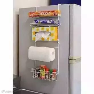 在冰箱的外部,可以把纸抽和保鲜膜斜挂在冰箱侧面