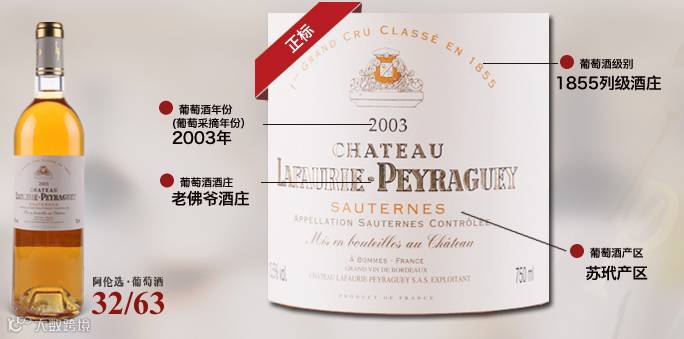 以老佛爷酒庄贵腐葡萄酒为例,酒标可看出葡萄酒的名称、年份、酒精度、产区、净含量等信息