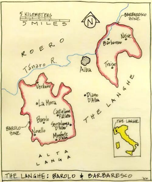 1981年巴巴莱斯科成为意大利全国的诸多产区中最早被认可的DOCG级法定产区。它位于兰盖(Langhe)丘陵之内,塔纳罗河南岸,北临巴贝拉•阿斯蒂(Barbera d’Asti),东接莫斯卡托•阿斯蒂(Moscato d’Asti),向西南望去则是声名赫赫的巴罗洛(Barolo)产区。巴巴莱斯科产区在土壤、地形、品种和产品风格上都与巴罗洛非常相似。但相比于巴罗洛的“王者之酒”,巴巴莱斯科则是优雅但却能摄人魂魄的“葡萄酒王子”。
