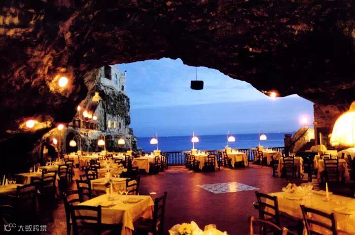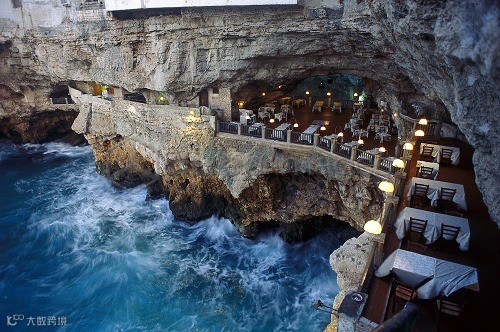 Grotta Palazzese餐厅,位于意大利南部普利亚大区的Polignano镇,与Grotta Palazzese酒店相连,镶嵌在一个拱形的石灰岩溶洞内,面向亚得里亚海(Adriatic Sea)。旅客可以品尝当地的橄榄和贻贝,手捧一杯深红色的Primitivo葡萄酒,听着海水拍击海岸的浪声,任凭轻柔的海风吹拂你的脸庞……