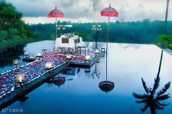 巴厘岛上的Kupu Kupu Barong让人仿佛是热带雨林里高高凸起的无敌海景游泳池,中间立起的小柱基。周围洒满花瓣,打开一瓶库克香槟,你将会享受到前所未有、并将永远怀念的浪漫体验。