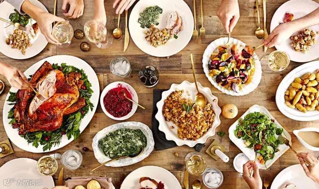 火鸡是感恩节的传统主菜,通常是根据喜好,在火鸡肚子里塞上以各种调料,切碎的蔬菜和谷物类混合的馅料,然后整只烤出,用刀切成薄片,分送给大家享用,“分享”是感恩节的重要精神。