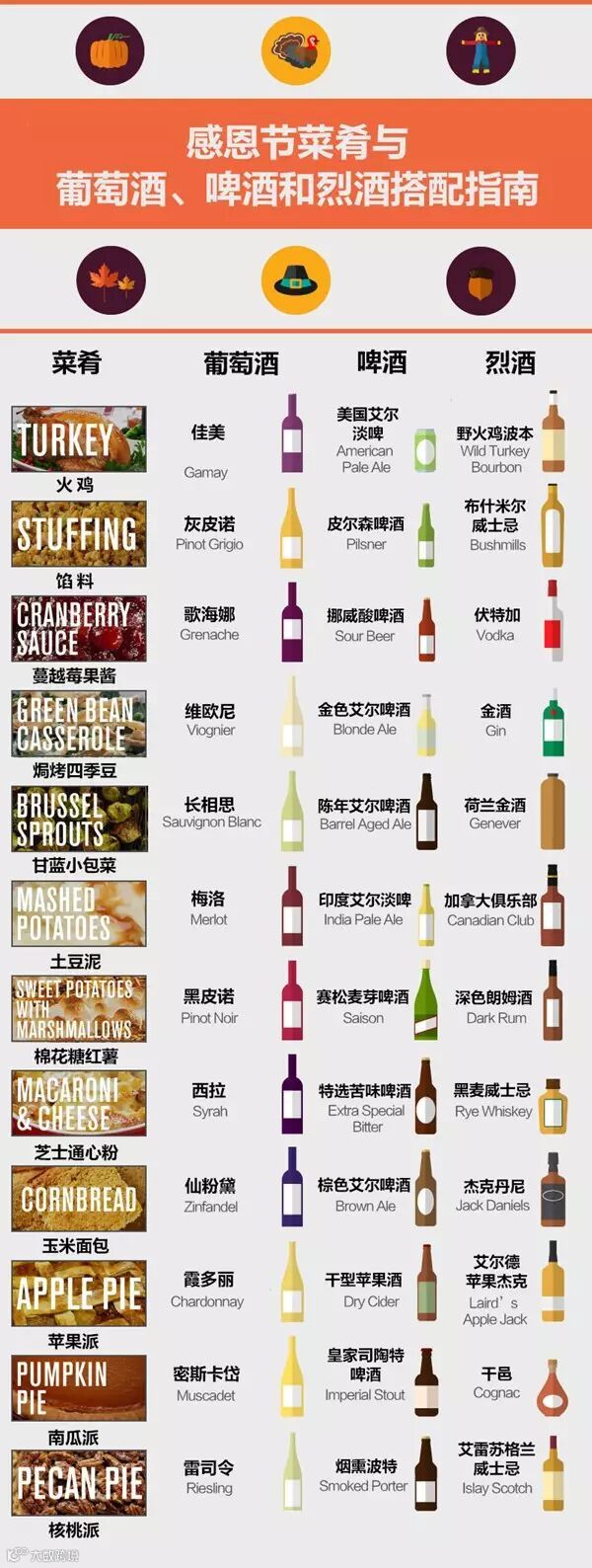下面这张图,完整的列举了感恩节常见的美食佳肴与葡萄酒、啤酒喝烈性酒的搭配,赶快动手收藏吧,感恩大餐如何搭,有它就够了。