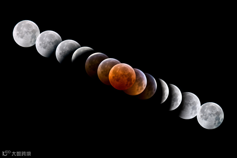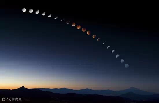 3、要想拍摄“月食葫芦串”,需选用能连续在同一幅画面中多次曝光的相机和广角镜头,并准备好三脚架来固定相机,每隔15分钟左右拍一次。也可以采用后期叠加的处理方法,把月全食的整个过程呈现在一张照片上。