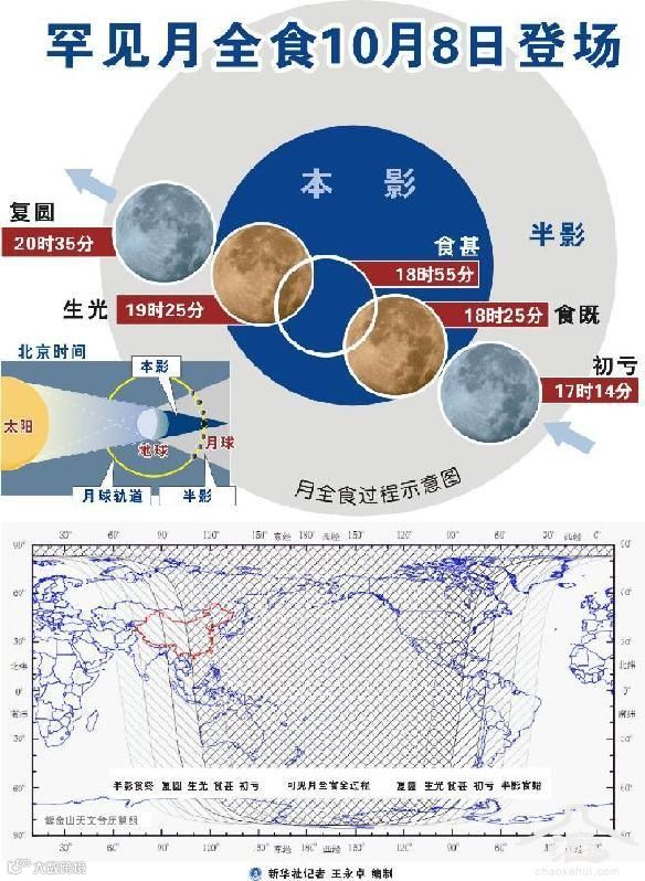 天文专家介绍说,本次月全食的初亏为北京时间8日17时14分,食既为18时25分,生光时刻为19时25分,复圆时刻为20时35分。其中,最精彩的全食时间长达近1小时。本次月全食最大的特点就是我国几乎全境可看“带食月出”。