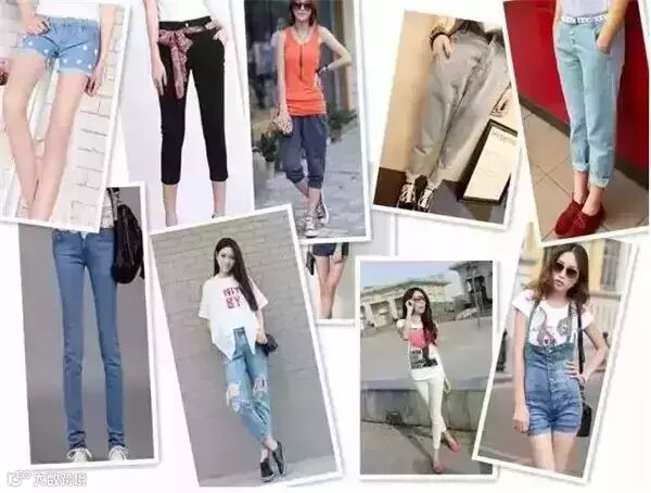 七分裤、八分裤、直筒裤、紧身裤、铅笔裤、小脚裤、喇叭裤、哈伦裤、运动裤、连体裤、牛仔裤、高腰裤、破洞裤……