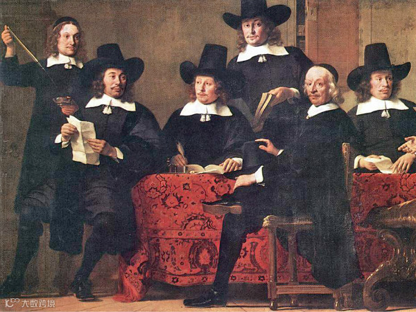 荷兰人素有海上马车夫之称,他们依靠发达的航运环游世界进行贸易。荷兰本国并不产酒,他们从欧洲各个产区挑选出符合顾客要求的原酒,再把这些成桶的酒转运到世界各地进行销售,因此葡萄酒贸易格外发达。这幅费迪南德·波尔(Ferdinand Bol)的作品就刻画了阿姆斯特丹葡萄酒商人组成的行业协会,他们或站或坐,手中拿着书卷或纸张,仿佛在制定葡萄酒贸易的规则,画面最左的绅士则手持一把提取葡萄酒的吸管,若有所思。虽然穿着统一的“制服”,画面中每个人的目光都投向不同的方向,显示行业协会中既有合作又存在竞争。