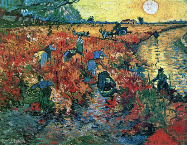 梵高一生中有过几幅有关葡萄园的作品,其中当属这幅红色的葡萄藤最为有名,因为这也是梵高有生之年唯一公开卖出的作品,仅仅过了五个月,梵高便以自杀的方式向世界告别。红色的葡萄藤完成于1888年梵高居住在法国南部城市阿尔勒期间。在这部作品之前,梵高刚刚完成了“绿色葡萄园”的创作。值得注意的是,梵高在给他弟弟的信中提到这部“红色的葡萄园”取景于10月底阿尔勒附近的葡萄园,农民们还在忙着采收。但按照常理,法国南部的葡萄采收季要远比10月早,而且正常情况下,葡萄园一般是在采收季结束后才会变为红色。这不禁让人思考:农民的采收是真实的吗?采收的时间是否正确,抑或这只是梵高的艺术想象?