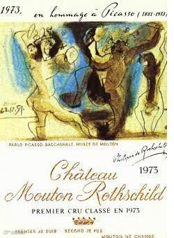 1973年属于伟大的毕加索。这一年,是波尔多地区葡萄酒的平凡之年。但这一年的木桐酒却因两年后毕加索的去世而被红酒爱好者竞相收藏。在古希腊神话中,每年春天葡萄开始发芽都举行“酒神祭”,毕加索的这幅画就是描绘酒神巴库斯与众神和女徒饮酒狂欢的情景。