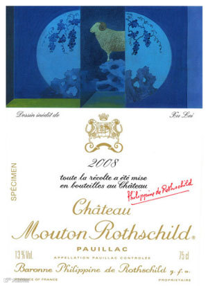 2012年份木桐酒庄酒标的设计灵感来自于木桐酒庄的家徽——两只公羊。酒标设计师,西班牙人——Miquel Barcelo生于1957年。他的作品于1996年在巴黎现代艺术博物馆展出,其水彩作品再次于2004年在卢浮宫展出。在过去二十年里这位艺术家名声大噪。
