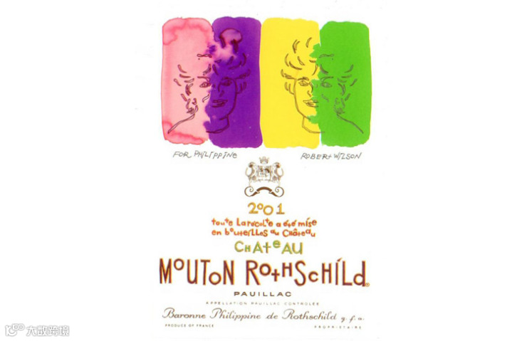 来自美国德克萨斯州的艺术家罗伯特•威尔森(Robert Wilson)用绿色表达了葡萄嫩枝,金色代表阳光,红色和紫色分别代表葡萄酒成熟的阶段,在颜色中有若隐若现庄主菲利普女男爵的线条形象。