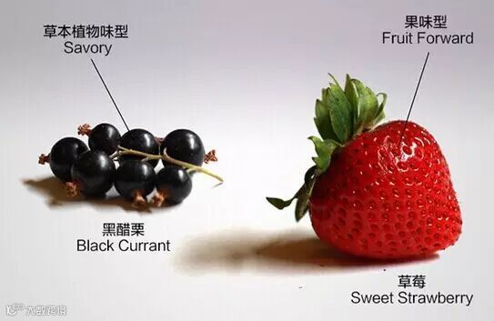 描述果味型红葡萄酒常见术语:覆盆子(Sweet Raspberry)、黑樱桃(Maraschino Cherry)、黑莓味(Blackberry)、蓝莓味