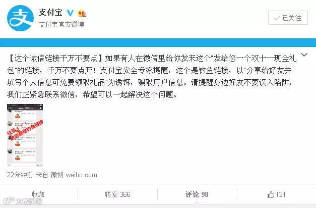 今天下午,支付宝官方微博发出通知:如果有人在微信里给你发来这个“发给您一个双十一现金礼包”的链接,千万不要点开!支付宝安全专家提醒,这个是钓鱼链接,以“分享给好友并填写个人信息可免费领取礼品”为诱饵,骗取用户信息。请提醒身边好友不要误入陷阱。