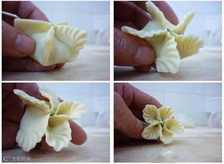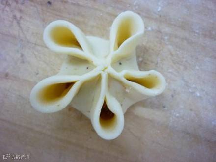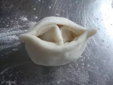 把面团搓条,下剂子擀皮,包入馅心。把圆皮均分5点,粘在一起形成5条边,把口捏紧