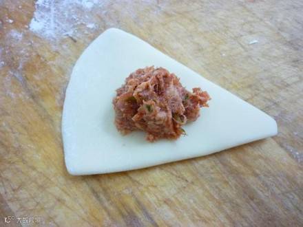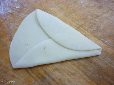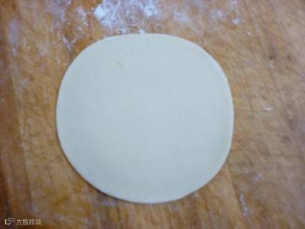 制作方法:面粉加入开水烫成面团,揉光搓条下剂子,擀成圆皮