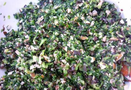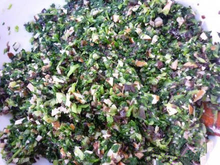 制作方法:青菜洗净入开水锅烫一下,和洗净的木耳、香菇、笋一起切碎,挤去多余水分,加盐、鸡精、糖和麻油调好口味