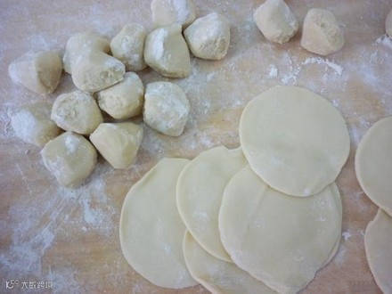 制作方法:面粉用开水烫成面团,揉光揉匀。下剂子,擀成圆皮。
