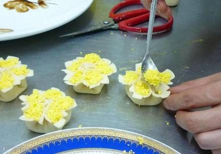 把熟蛋黄碾碎,放入花瓣中作点缀
