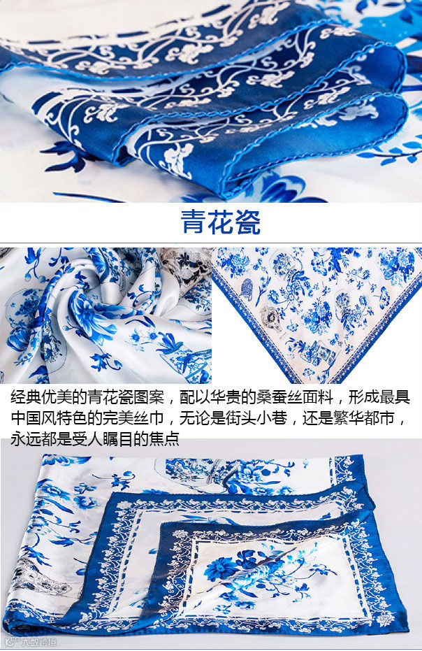 富事丝绸青花瓷丝巾,100%真丝加工而成,经典花色,手感丝滑,价格比淘宝还便宜