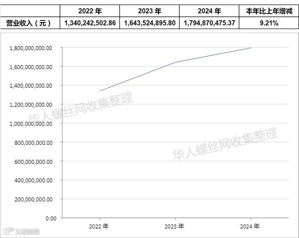 2024年,飞沃科技实现总营业收入179,487.05万元万元,同比增长9.21%;产品分类中,紧固件以157,124.34万元的处于首位,占比达到了87.54%;市场分布上,国内营业收入为162,955.21万元,占比高达90.79%,国际营收为16,531.84万元,占比为9.21%。