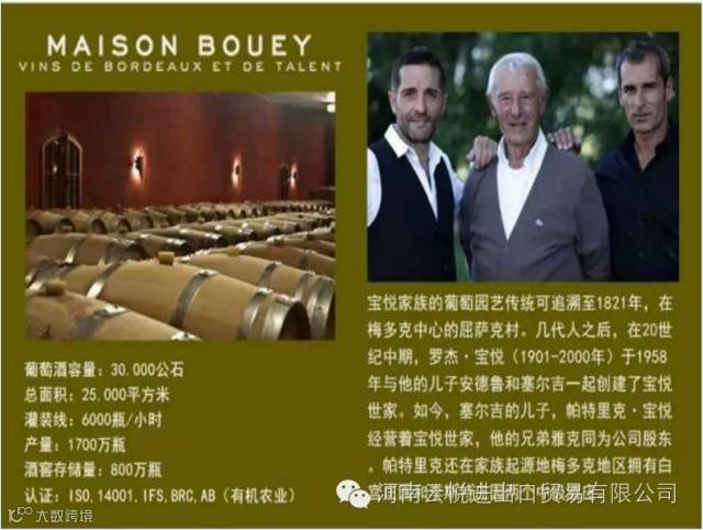 MAISON BOURY-宝悦世家,1821年在梅多克产区就拥有自己的葡萄园,1932年旗下的白宫堡(châteaumaisonblanche ) 和 李斯特(châteaulestruelle)酒庄列为中级庄中的一级酒庄。宝悦世家涵盖法国波尔多所有级别的酒,作为法国大型超市与全世界关键市场不可缺少的供应商,产品销往全世界60多个国家,凭借专业存储酒库及一项尖端的酿酒技术在整个波尔多葡萄酒出口贸易中占据主导地位。