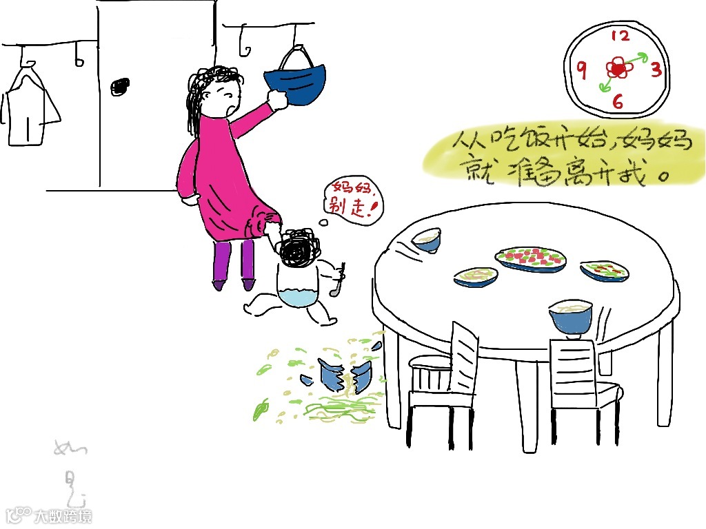 每天的早餐时间,是我最害怕的时候,因为我知道妈妈吃完饭就会离开我,所以我慢慢吃慢慢吃,希望妈妈一直耐心地陪着我,可是不管我吃多慢,妈妈还是一到时间就背着包出门了,我只好拽着她的衣角大声哭闹,也许这样她就不会走了呢?可是她也只是转过身来给我一个宝宝,叫我乖乖在家,听奶奶的话.....我不明白为什么妈妈不能在家陪我.....