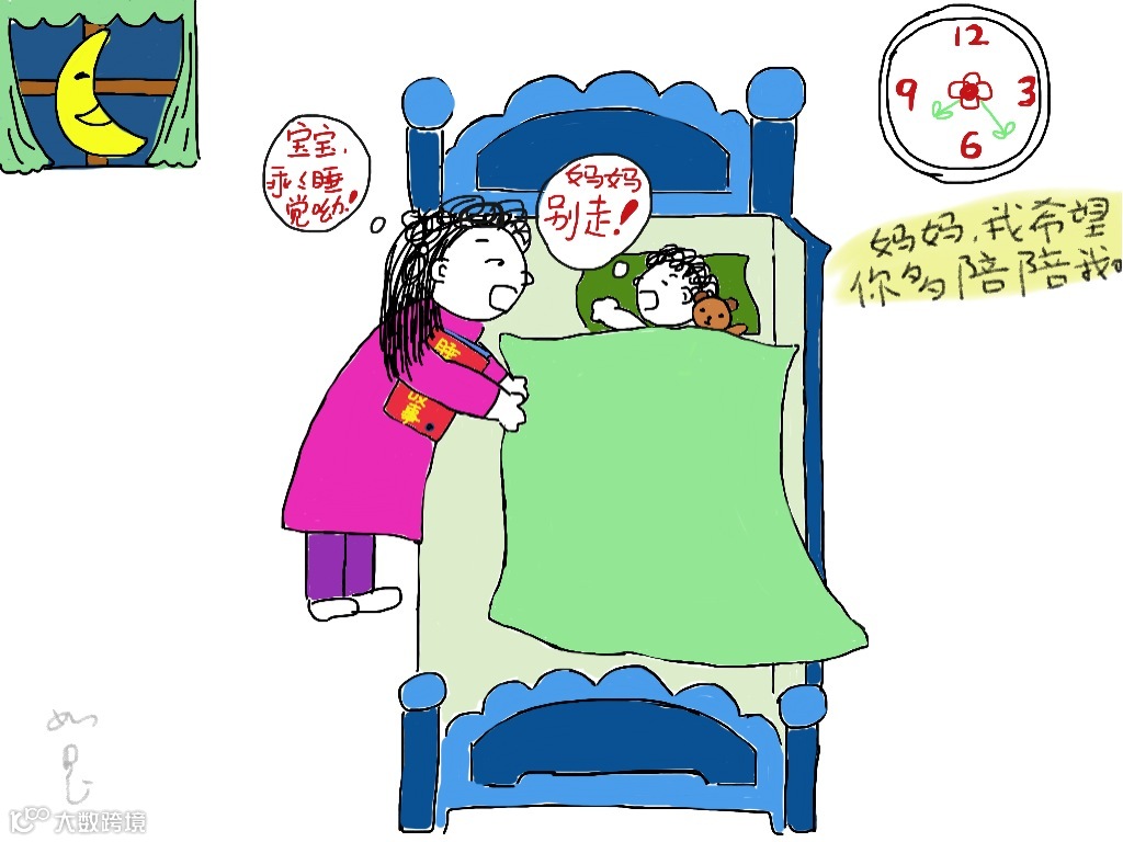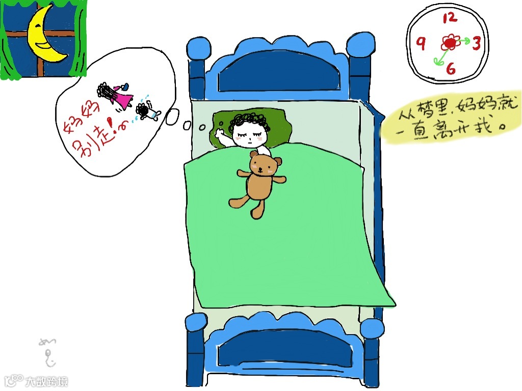 睡前时光。是我一天中最快乐的时间啦!因为妈妈终于忙完了,这是彻彻底底属于我的妈妈啦!我赖着她给我讲了好几个故事,还和妈妈一起唱了好多儿歌....舍不得睡觉。可是妈妈在讲完最后一个故事的时候,一边合上故事书,一边亲亲我的额头,我就知道,妈妈又要走了....“妈妈,我想你陪我睡觉”。“乖宝宝,你已经长大啦!要学会自己睡觉咯!”哎~每次都是这一句。我不明白为什么妈妈不能一直陪着我....